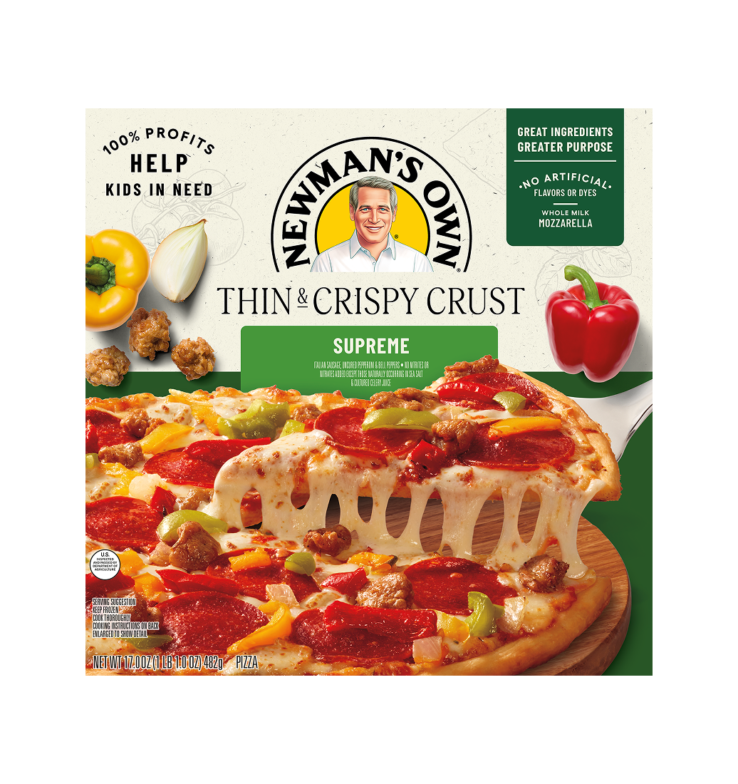 Newman’s Own Thin & Crispy Supreme pizza gives us that traditional blend of Italian sausage, pepperoni, red and yellow bell peppers and onions. But wait, there’s more! It’s all wallowing in the tastiest of sauces, covered with whole milk mozzarella, and sitting atop our signature thin & crispy crust to give you the perfect crunch.