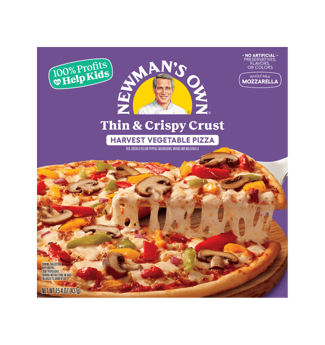 Una mezcla de sabores frescos de pimientos rojos, verdes y amarillos, champiñones, cebollas rojas, combinados con mozzarella pegajosa y nuestra característica corteza multigrano. La pizza Newman’s Own Thin & Crispy Harvest Vegetable es ideal para toda la familia y no contiene conservantes, saborizantes ni colorantes artificiales.