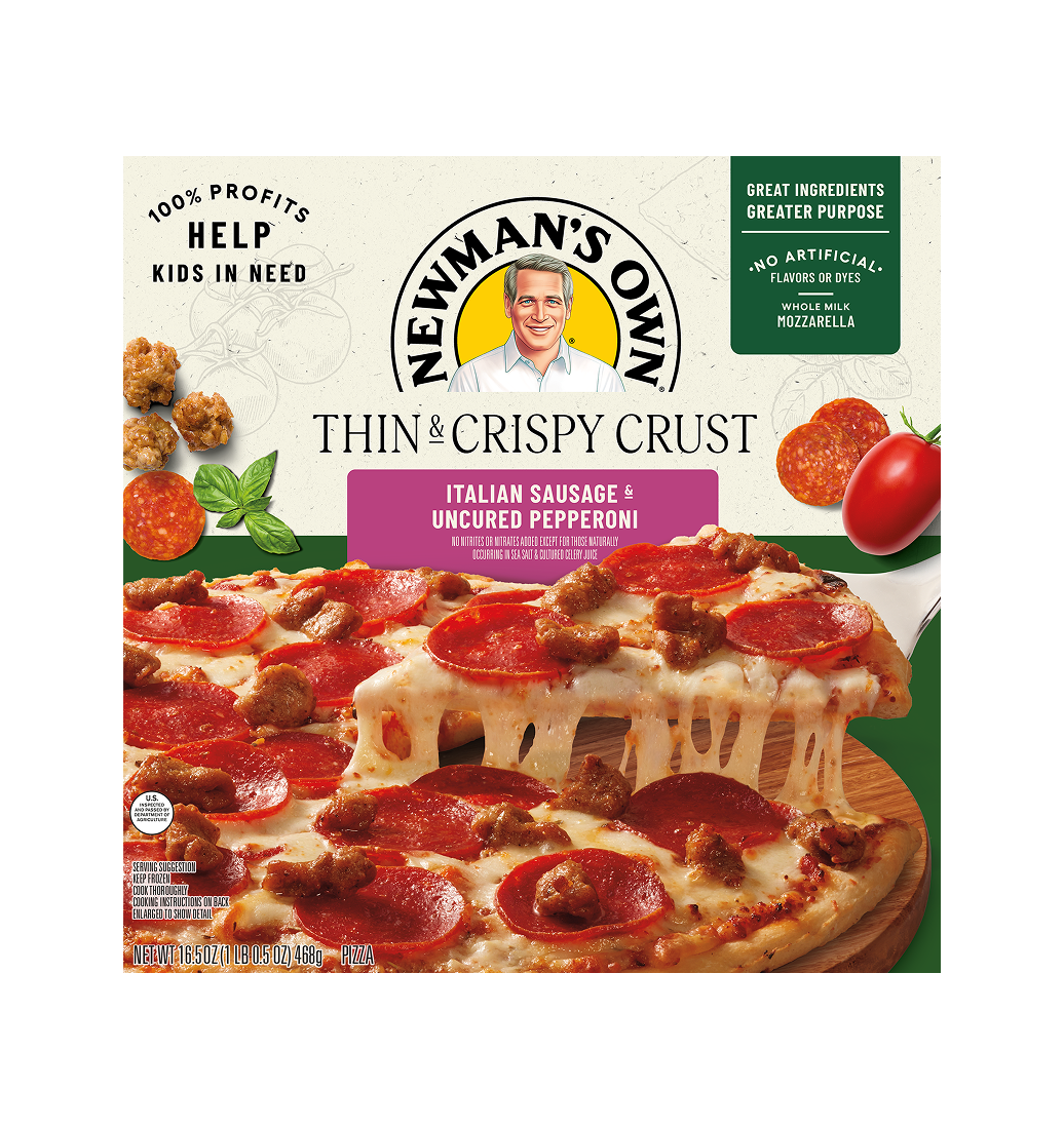 If your idea of a good time is pepperoni and sausage atop a bed of robust tomato sauce and whole milk mozzarella, Newman’s Own Thin & Crispy Italian Sausage & Uncured Pepperoni pizza is here for you. This flavor adventure is ready to please the whole family any day of the week.