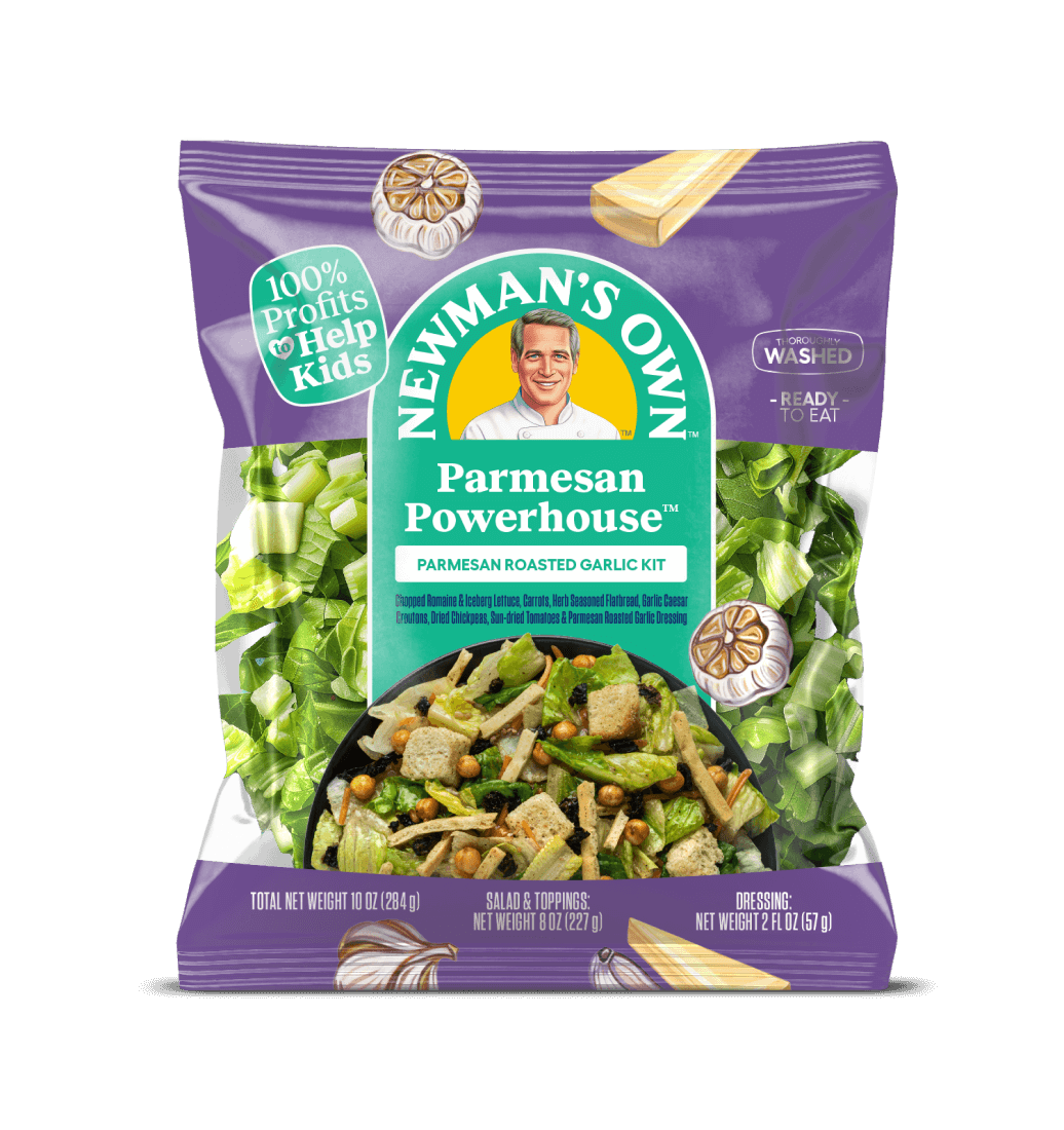 Freshly chopped romaine and iceberg lettuce, herb seasoned flatbread, garlic brioche croutons, dried chickpeas, sun-dried tomatoes, shredded carrots and Newman’s Own Parmesan Roasted Garlic dressing.
